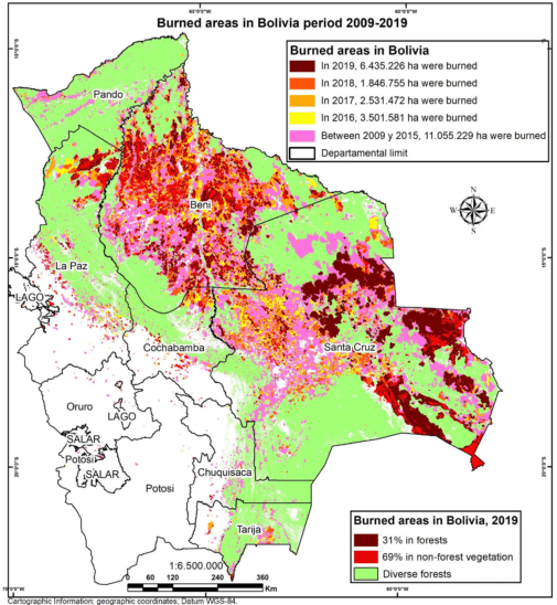 Algunas normativas que impulsaron la deforestación y quemas en Bolivia en los últimos años fueron las leyes 337, 502, 739 y 952 que legalizaron los desmontes ilegales consolidando con ello el cambio de uso de suelo en las tierras bajas bajo el pretexto de producción de alimentos entre los años 2013 a 2017 tanto para la agricultura y la ganadería. El Decreto Supremo 3973 de 2019 fue controversial, ya que autorizó desmontes en tierras de vocación forestal [2] en los departamentos del Beni y Santa Cruz, aspecto antes limitado por diversos instrumentos de gestión según los Planes de uso de suelos de dichos departamentos. Esto generó que el mismo año se quemarán 6,43 millones de hectáreas en toda Bolivia, principalmente en estos dos departamentos (Figura 1). En 2020 y 2021, las quemas alcanzaron cifras de 4,54 y 1,50 millones de hectáreas respectivamente con grandes pérdidas boscosas, de nuevo principalmente en Beni y Santa Cruz.
