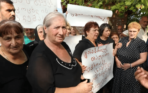 Protest in Rgani village, sign reads “Some houses that used to stand on the meadow now stand on the edge of a cliff several meters deep”. Local Environmental Initiative