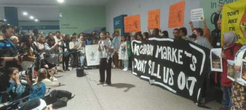 Protesters at COP 29 in Baku call for an end to carbon markets and other false climate solutions.